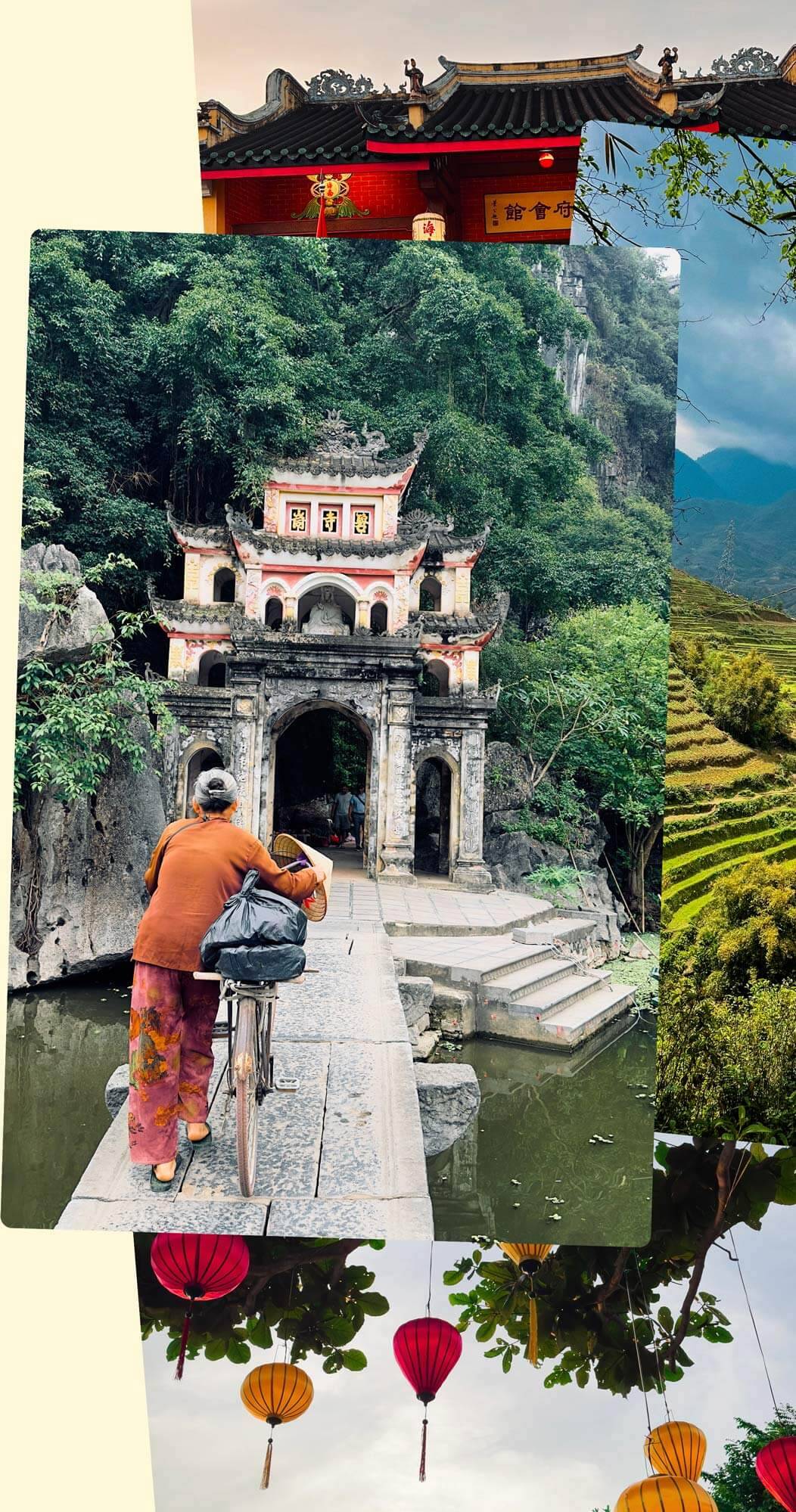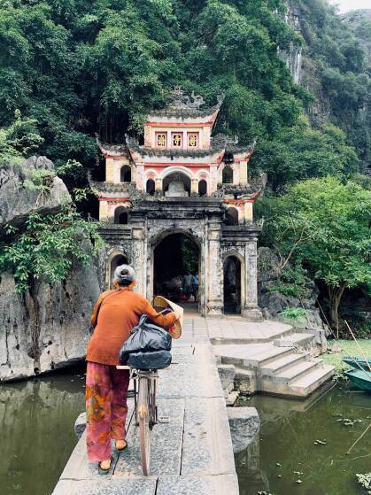 De volgende ochtend verlaten we de baai en trekken verder landinwaarts. Buiten de steden wordt alles groener. In Ninh Binh fietsen we op onverharde paden langs eindeloze rijstvelden, onderbroken door kalkstenen rotsen die eruitzien alsof iemand ze met een liniaal getekend heeft.