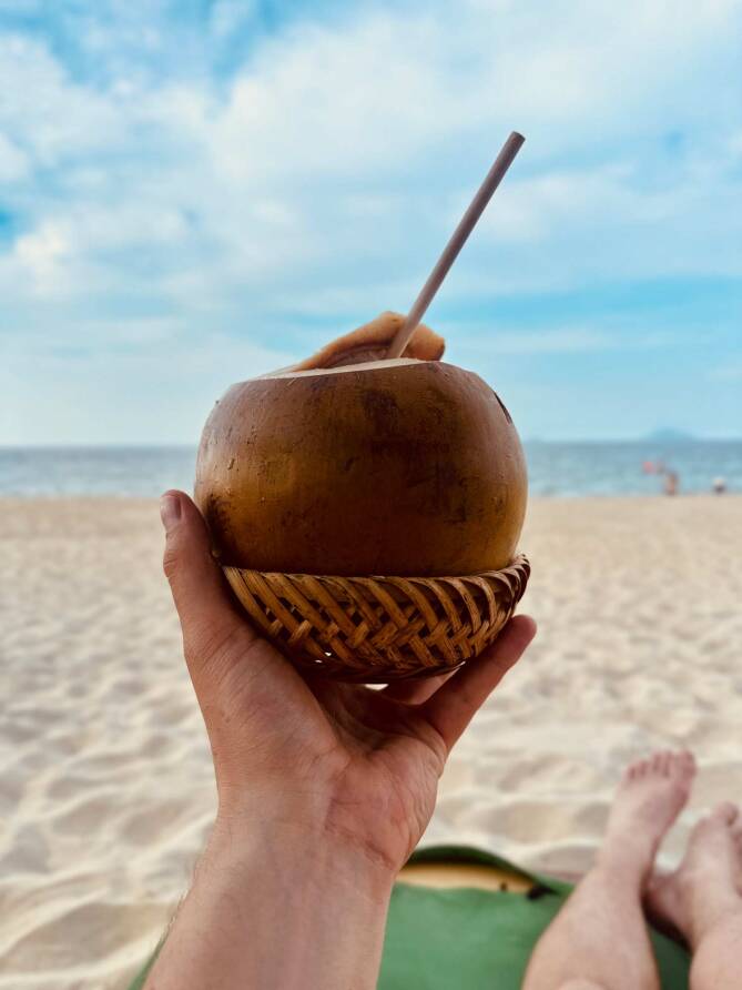 Vanuit Ninh Binh nemen we de nachttrein naar Hoi An. ’s Ochtends schuiven we de gordijnen open en zien hoe de kust ons tegemoetkomt: blauwe zee, palmbomen, lucht die plots tropisch aanvoelt.