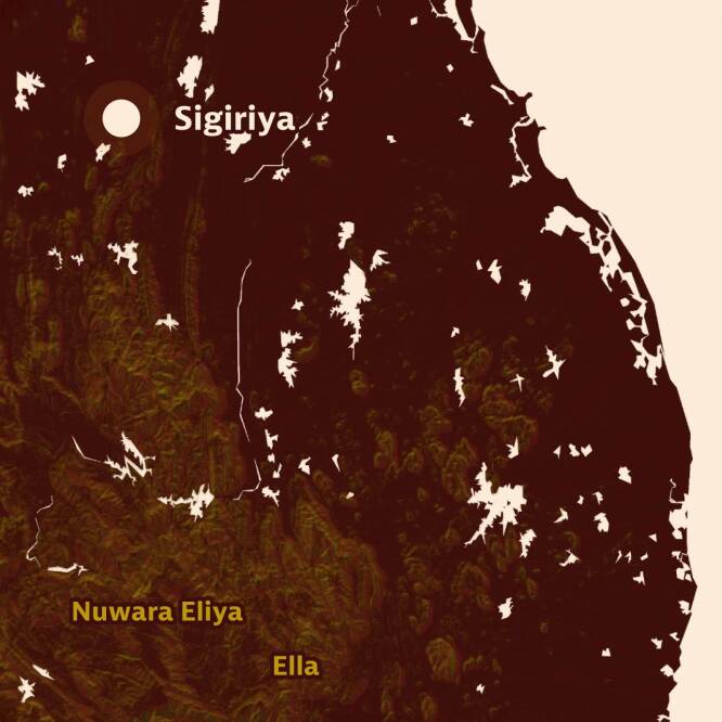 In het midden van het eiland torent hoog boven een groen tapijt van bomen een ander icoon: de imposante Leeuwenrots van Sigiriya. Op de top stond ooit het paleis van koning Kassapa, gebouwd tussen 477 en 495 na Christus.