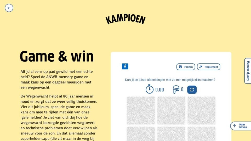 Altijd al eens op pad gewild met een echte held? Speel de ANWB-memory game en maak kans op een dagdeel meerijden met een wegenwacht.