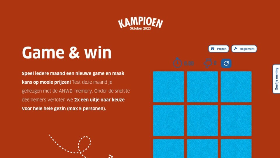 Speel iedere maand een nieuwe game en maak kans op mooie prijzen! Test deze maand je geheugen met de ANWB-memory. Onder de snelste deelnemers verloten we 2x een uitje naar keuze voor hele hele gezin (max 5 personen).