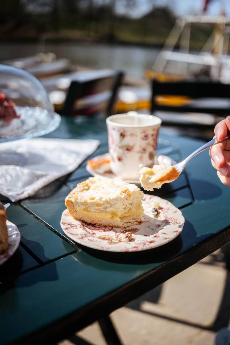 Vlak voordat we Arkel bereiken steken we met een klein pontje over naar Spijk. Maar voordat we de oversteek maken, nemen we de tijd om onszelf te trakteren op een heerlijk taartje.