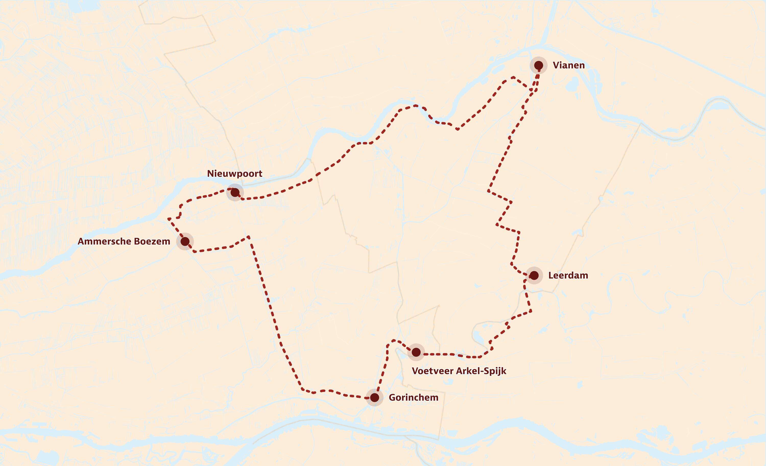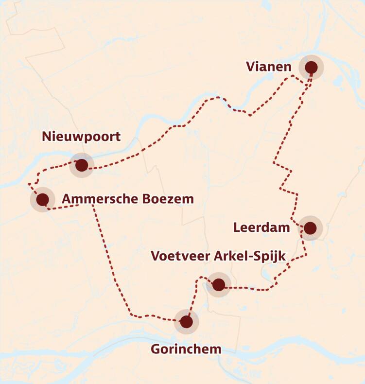 We rijden door enkele boomgaarden terug naar de laatste plaats van onze tocht: Vianen. Via de iconische Lekpoort komen we het stadje binnen. Langs historische gebouwen, het Oude Stadhuis en de Grote Kerk met zichtbare resten van de oude stadsmuren.