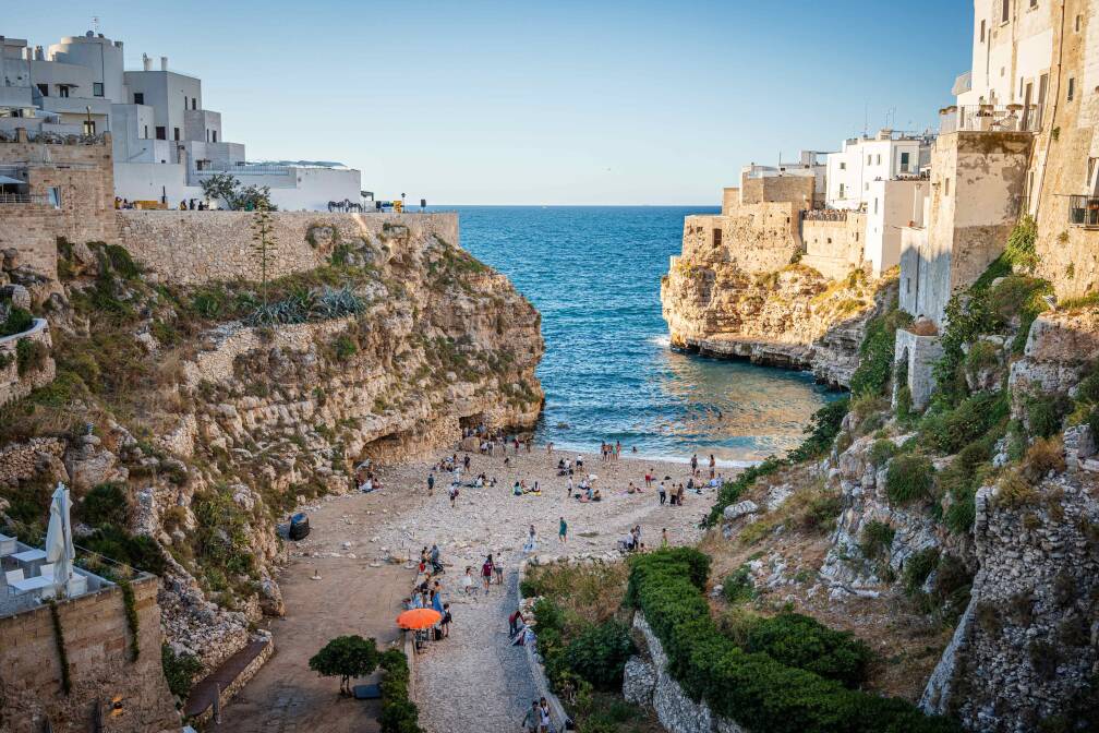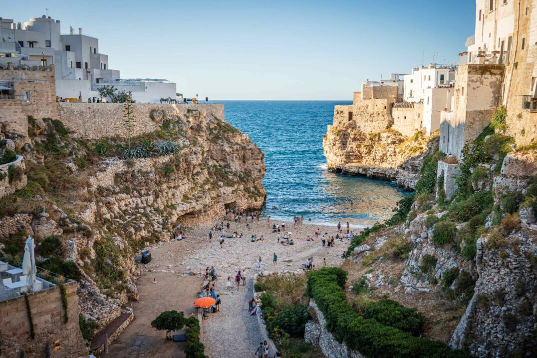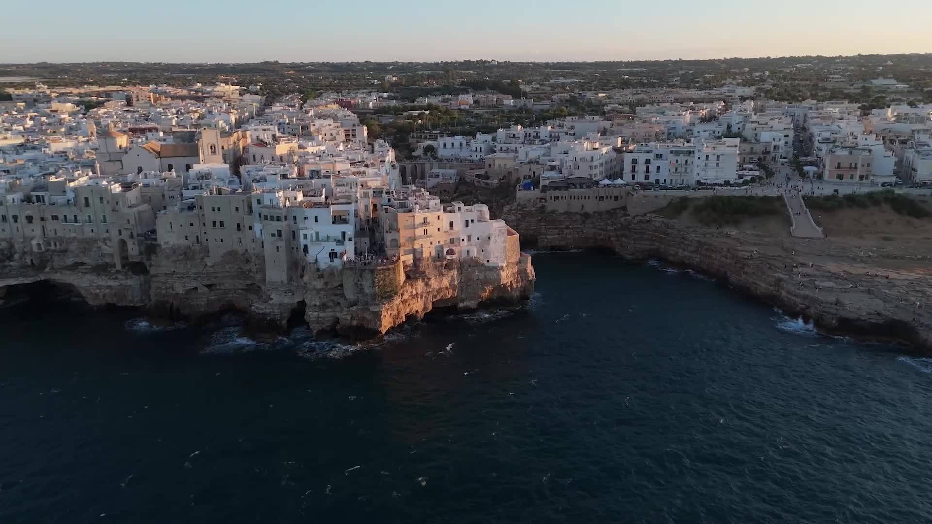 Langs de kust rijd ik door naar Polignano a Mare, waar de witte huizen boven de hoge kliffen warm kleuren in het licht van de ondergaande zon.