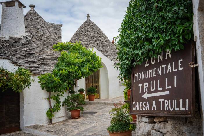 Trulli zijn kalkstenen huisjes met een kegelvormig dak. Ze stammen uit de 16de eeuw en werden gebouwd zonder cement, zodat bewoners ze snel konden afbreken om belasting op onroerend goed te ontwijken. Vandaag zijn ze Unesco Werelderfgoed en hét symbool van de Valle d’Itria.