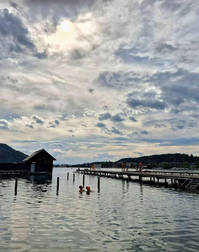 De laatste kilometers kleurt de Drau groen als mijn fietshelm. En dan wacht de grote beloning van deze fietsweek, de Klopeiner See met het warmste zwemwater van Oostenrijk. Er zijn badhuizen op palen en steigers die geuren naar sauna. Drijven, dobberen en nagenieten van 290 kilometer trappen.