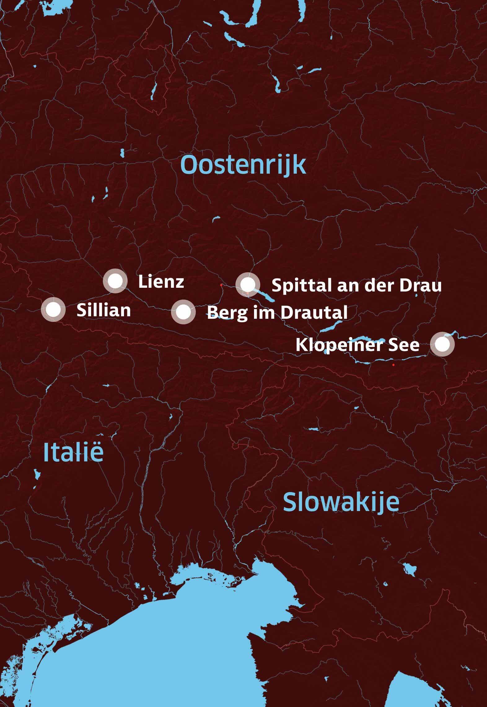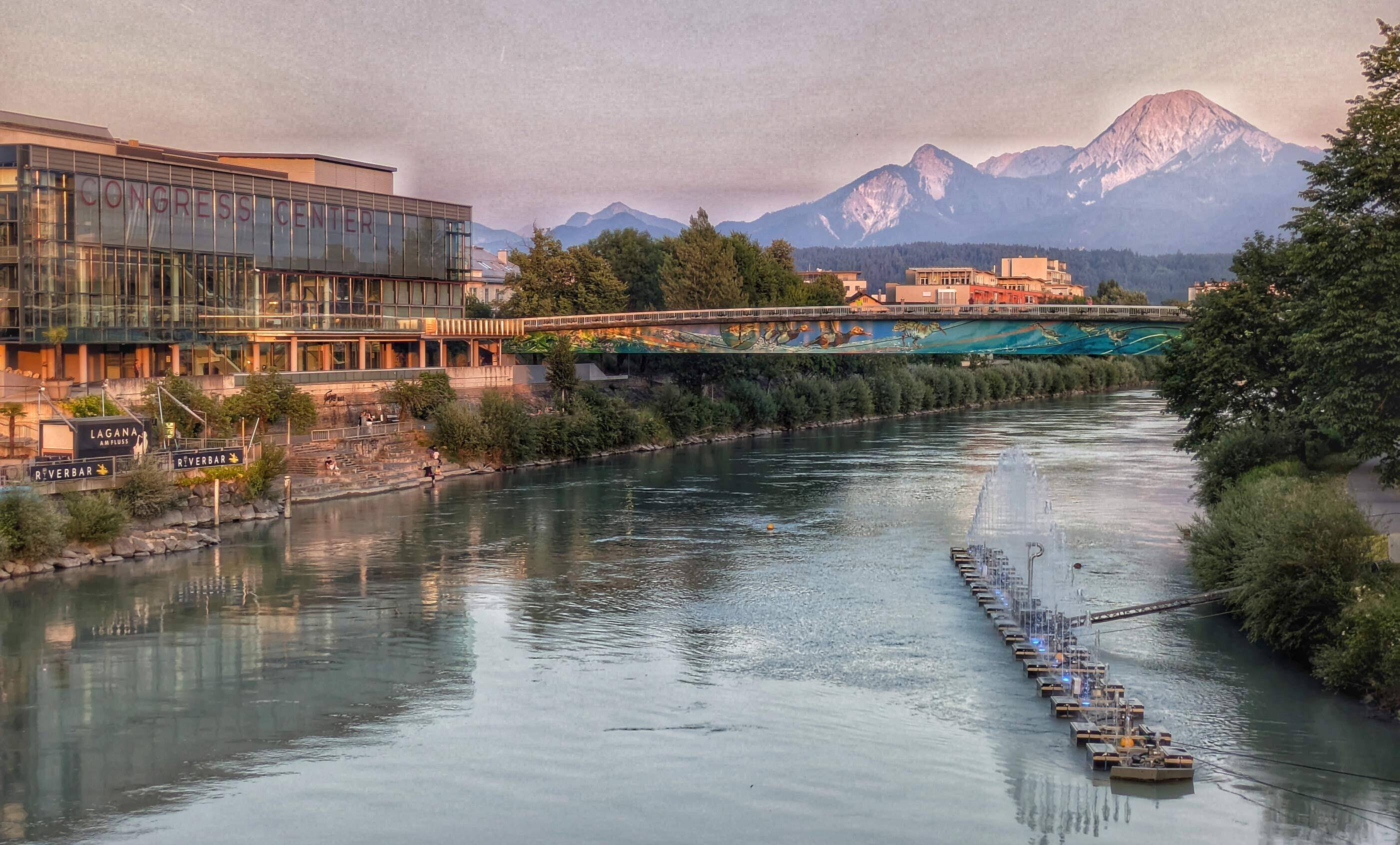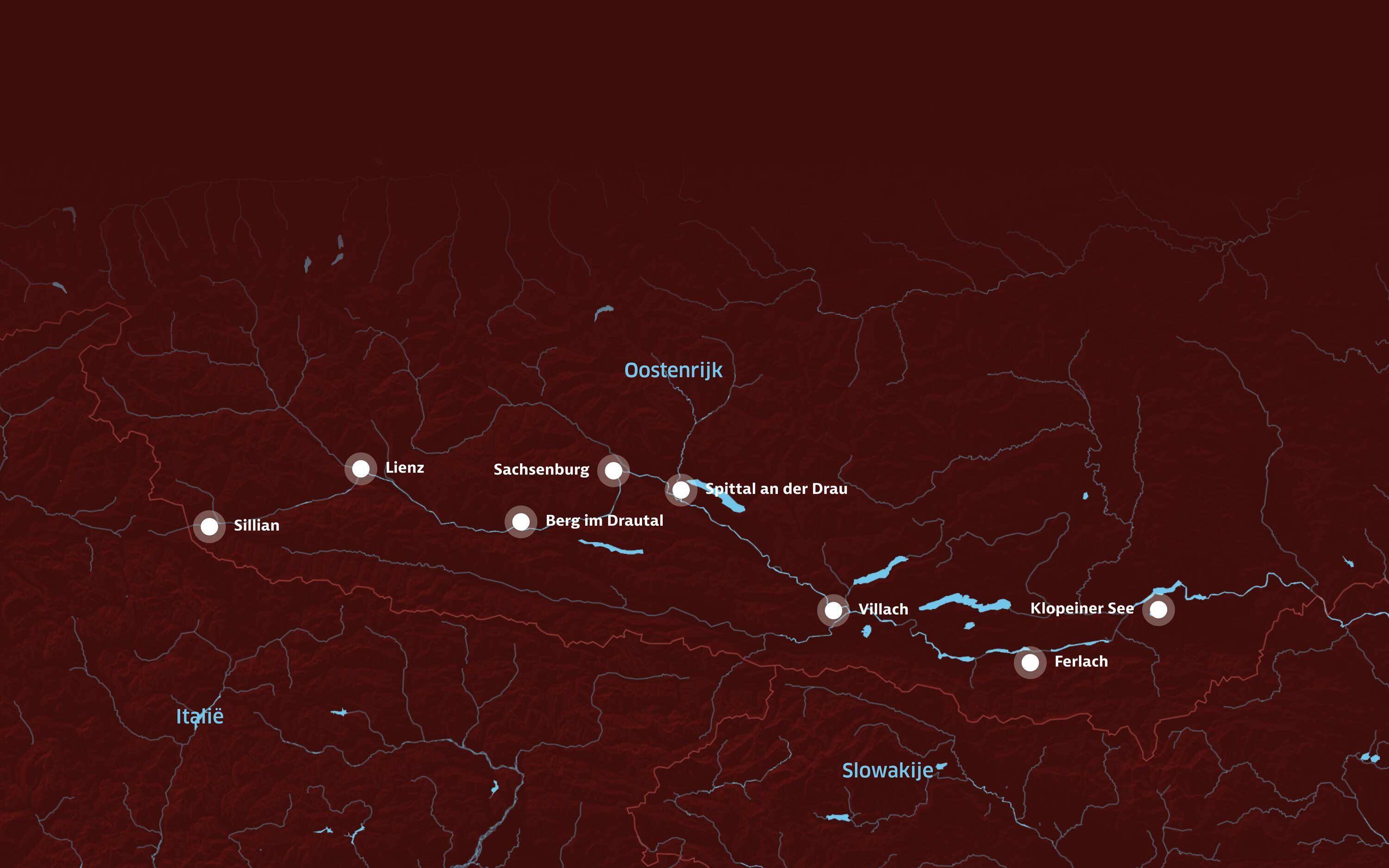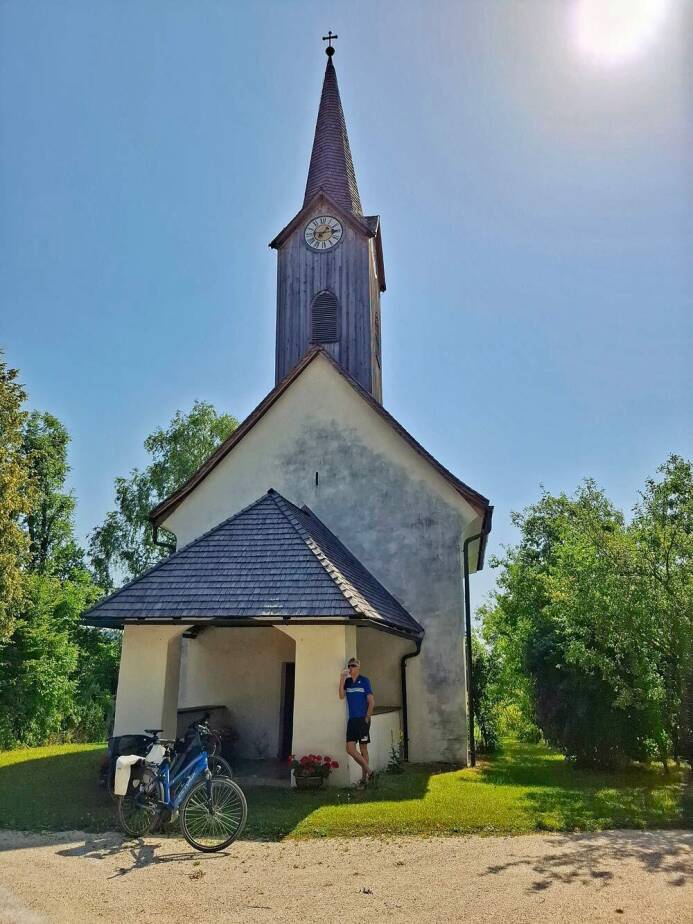 Fietsdag vijf voelt de wind om 10 uur als een lauwe föhn. Wat is de route weer mooi. De kerkjes in Emmersdorf, Bergl en St Lambrecht hebben ranke torentjes. Vanaf hier rijden we dicht langs de Drau, die verkleurt van Curaçao Blauw naar Matcha Latte. Gletsjerwater sijpelt de rivier in. De kalkdeeltjes lossen op in het water en geven de Drau een melkachtige kleur. Net als we bijna bezwijken in de 36 graden, bereiken we de Badesee van Ferlach. ’s Avonds zien we vanaf ons terras de zon achter de Karawanken zakken.