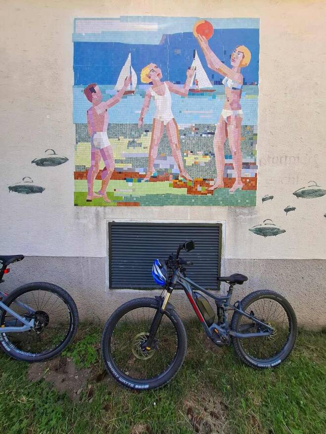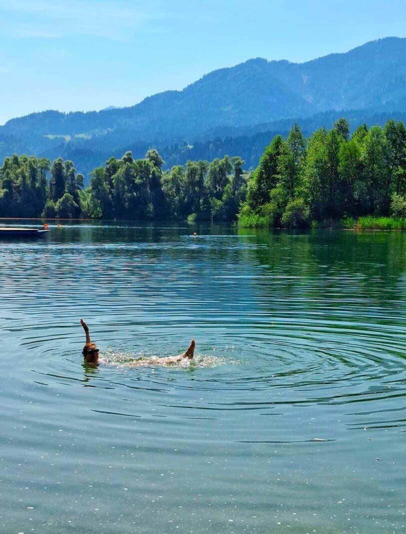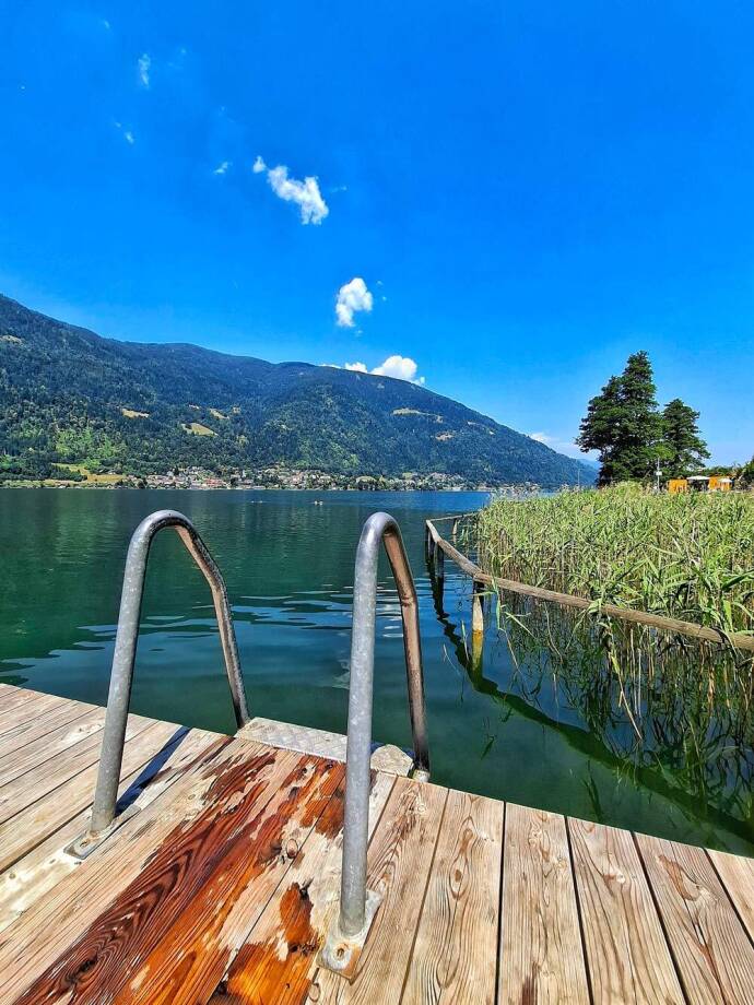 Oostenrijk heeft geen zeekust maar wel zo’n 25.000 (!) meren. Op dag vier, 34 graden, skippen we het rondje Ossiachersee en vallen neer bij Bikebeach St. Andrä. Gratis strand met ligweides, schaduwbomen en steigers om vanaf te plonzen in een fris bergmeer. Door een krakende speaker roept Michaela van het Strandbuffet dat de knödel van nummer 55 (dat zijn wij!) klaar zijn.